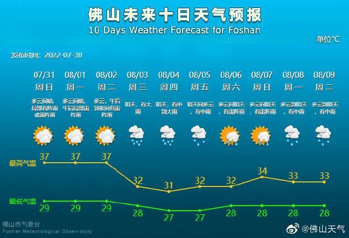 据佛山天气消息,预计未来几天高温天气持续,午后有阵雨或雷阵雨,局地可能伴有强雷电和短时大风等强对流天气;展望8月3日-5日将有一次明显降雨过程,高温有望缓解。
