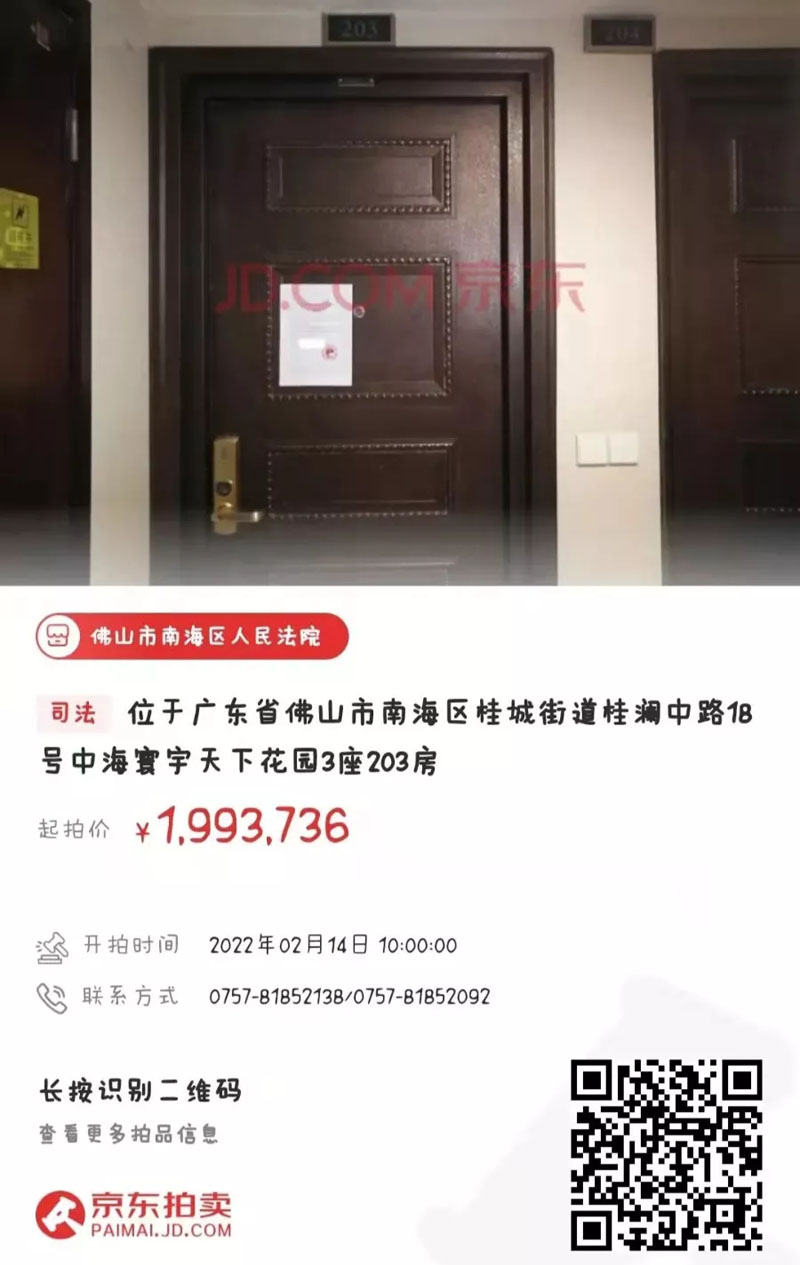 位于广东省佛山市南海区桂城街道桂澜中路18号中海寰宇天下花园3座203房,房屋建筑面积119.96平方米、房屋套内建筑面积95.07平方米,起拍价199.3736万元,评估价284.8193万元。