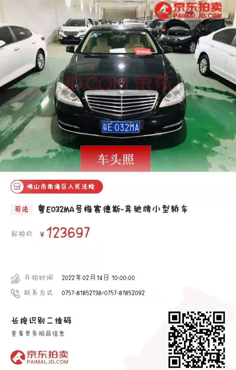 粤E032MA号梅赛德斯-奔驰牌小型轿车,车辆制造时间为2011年3月,起拍价12.3697万元,评估价17.6709万元。