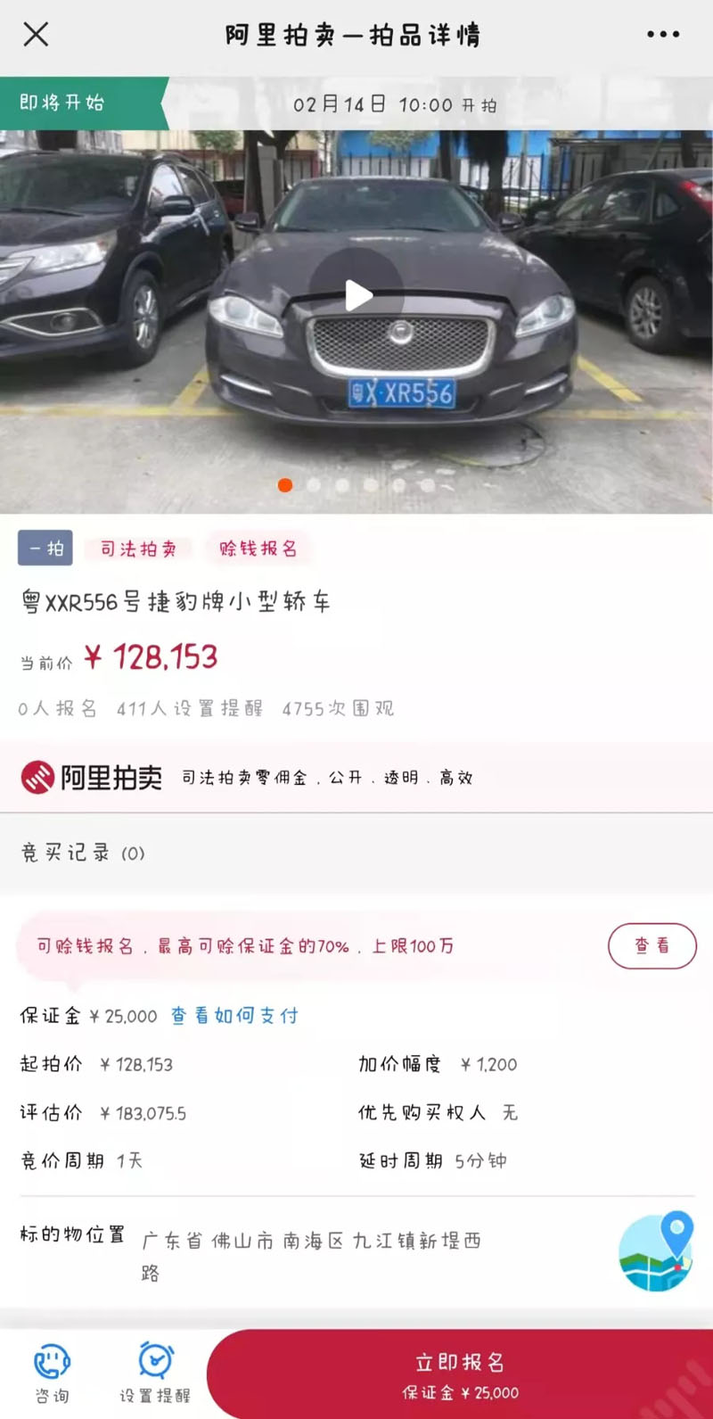 粤XXR556号捷豹牌小型轿车,制造时间2014年7月,起拍价12.8153万元,评估价18.3075万元。