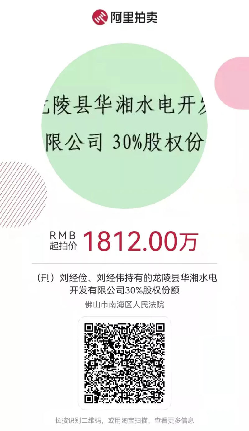 龙陵县华湘水电开发有限公司30%股权份额,起拍价1812.00万元,评估价3235.45万元。