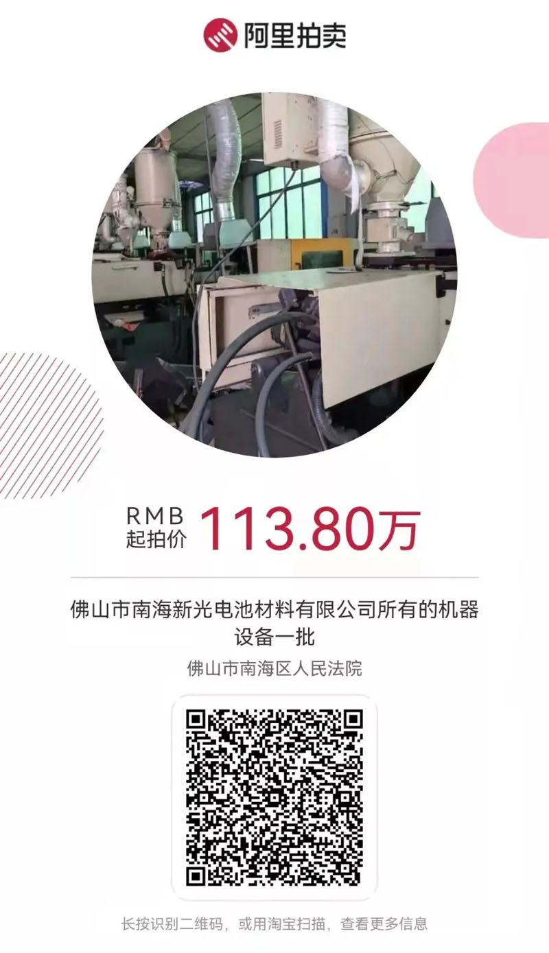 佛山市南海新光电池材料有限公司所有的机器设备一批,起拍价113.8086万元,评估价162.5836万元。