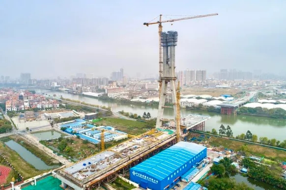 目前桥梁下部结构已全部完成、主塔已完成90%、主跨钢箱梁已完成50%,正在进行主塔上塔柱施工、主塔钢锚箱和钢箱梁制造安装、南庄岸路面工程施工、石湾岸引桥桥面系施工等。