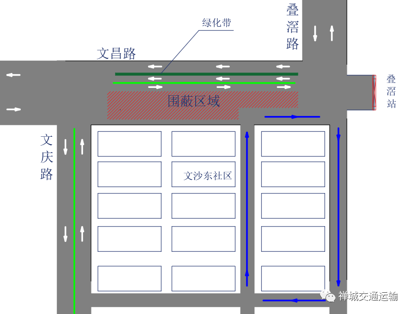 (一)将文昌路(文庆路-叠滘路)南侧进行封闭,原道路由双向4车道调整为双向3车道,其中东往西方向为2车道,西往东方向为1车道。