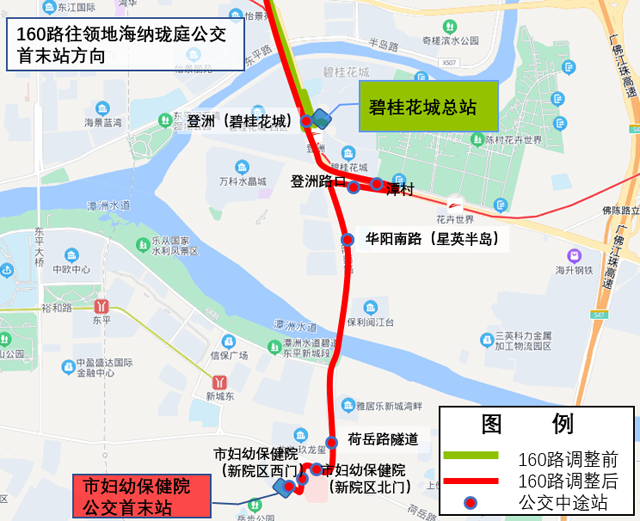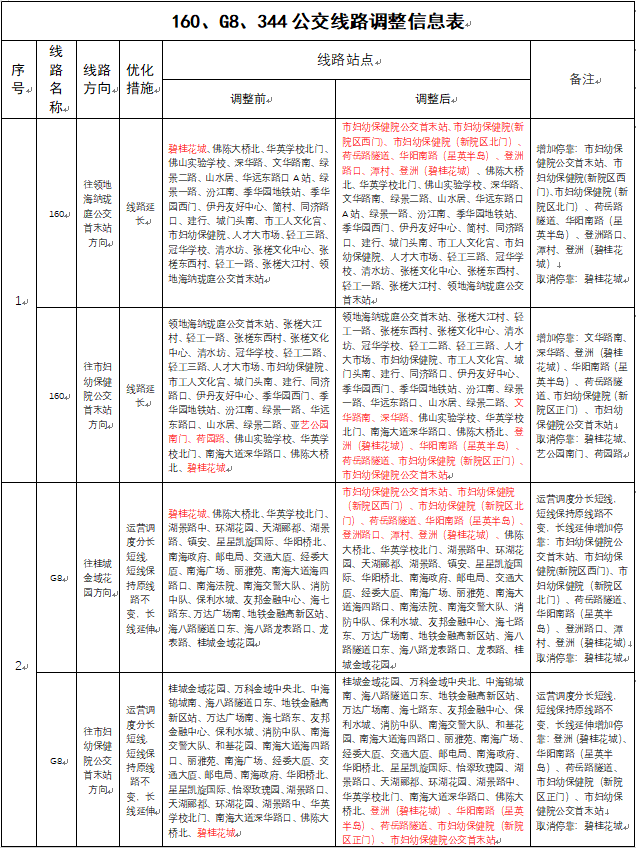 根据市妇幼保健院新院区公交出行诉求,结合周边现有场站建设及道路通行条件拟对周边公交160、G8、344等3条线路进行调整,加强新城片区与禅桂中心城区等人口密集区域以及妇幼保健院新旧院区之间的公交出行衔接,进一步方便广大市民公交就医出行。