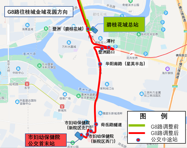 二、延长G8线路,路由由碧桂花城公交总站延伸至妇幼保健院公交首末站,加强桂城区域与新城区之间衔接