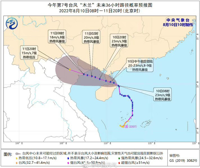 中央气象台发布,台风“木兰”于8月10日10时50分前后以热带风暴级在湛江徐闻沿海地区登陆。预计“木兰”将以20公里的时速继续向西偏北方向移动,并于10日下午进入北部湾,强度逐渐减弱。
