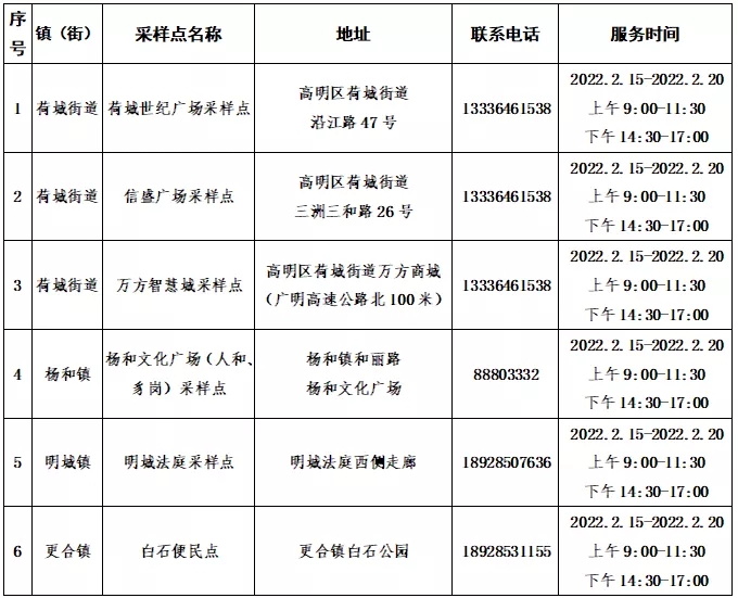 从2月5日(年初五)起,高明区对市外来(返)高明人员开展免费新冠病毒核酸检测。据统计,目前高明区大部分外出工作人员已返回高明,新冠病毒核酸检测需求有所下降,高明区核酸检测采样点现调整为6个。自2月15日至2月20日,凡从市外来(返)高明人员均可凭行程码、票证、通知短信等有效凭据,于返抵后24小时内前往高明区6个核酸采样点进行1次免费新冠病毒核酸检测。具体安排如下: