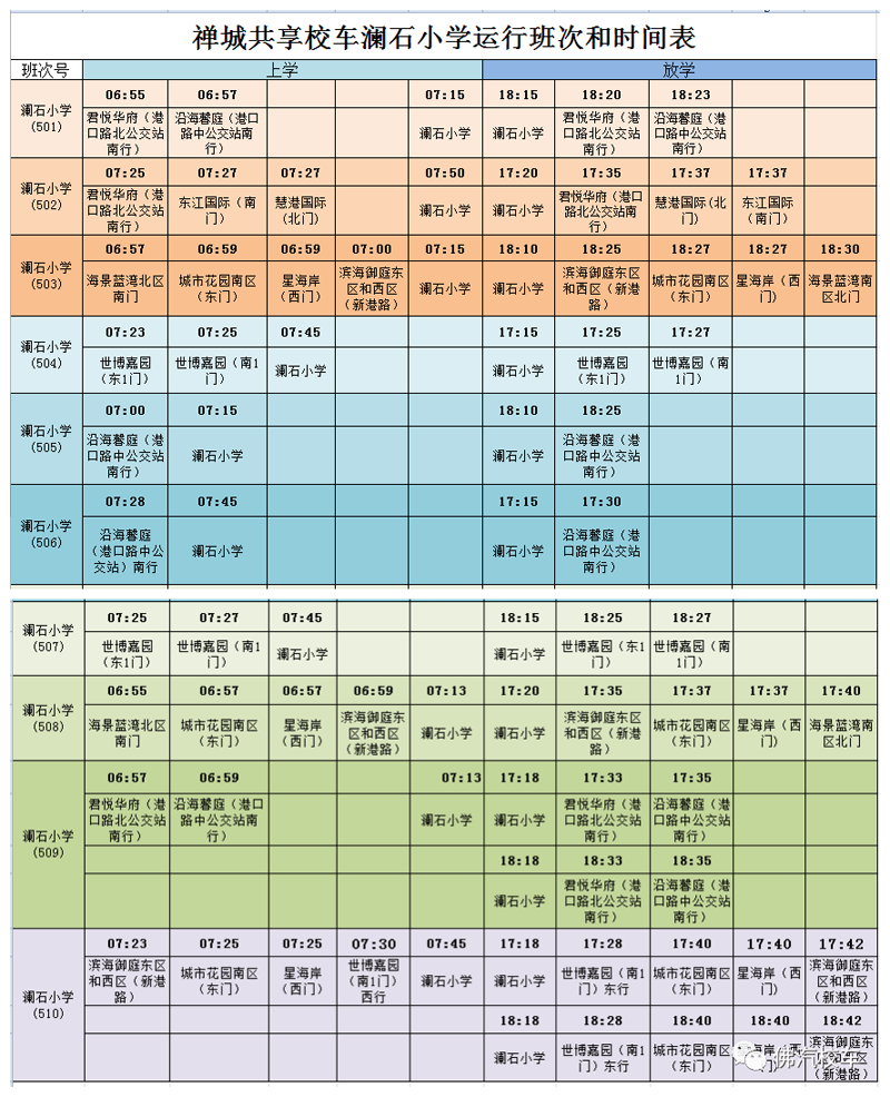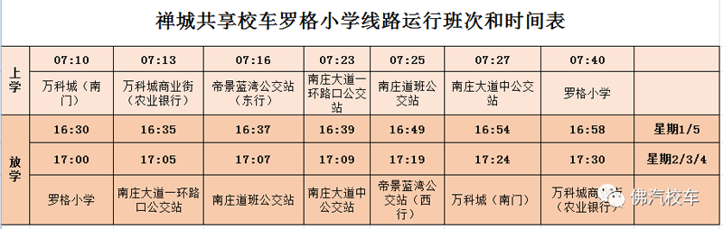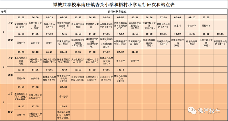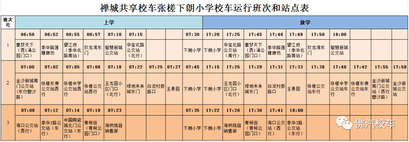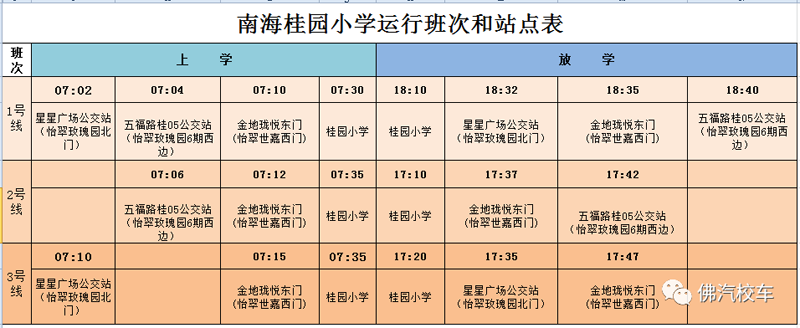 新的学期,为了更加方便同学们的出行,佛汽校车将会对环湖小学、河滘小学、澜石小学、罗格小学、吉利小学等线路优化调整,具体班次情况请见下表。