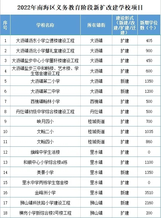 南海区教育局介绍,今年,南海区义务教育阶段计划年内投用的新改扩建工程达18个,包括了桂城街道映月四小、大沥镇第二小学、狮山镇科技路小学、里水镇美景小学等,预计可为南海提供超过1.6万个优质公办学位,其中小学14000个,初中2300个,进一步擦亮“品质教育 学在南海”的城市品牌。