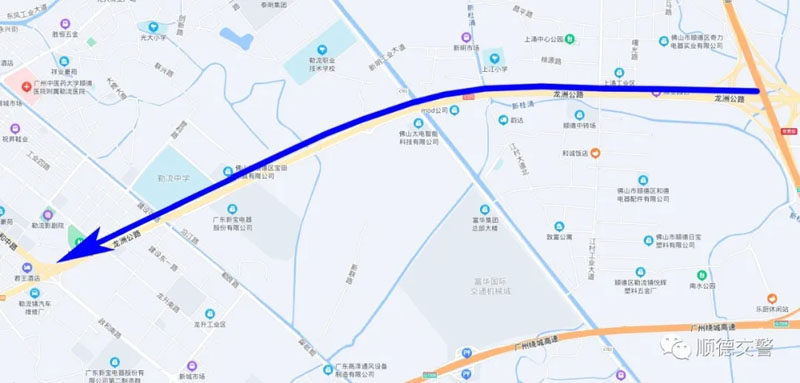 ■ 杏坛往龙江方向(由西往北)的车辆,直行至龙洲路新宝电器对开掉头位,掉头后经龙洲路政和路口右转往龙江方向。