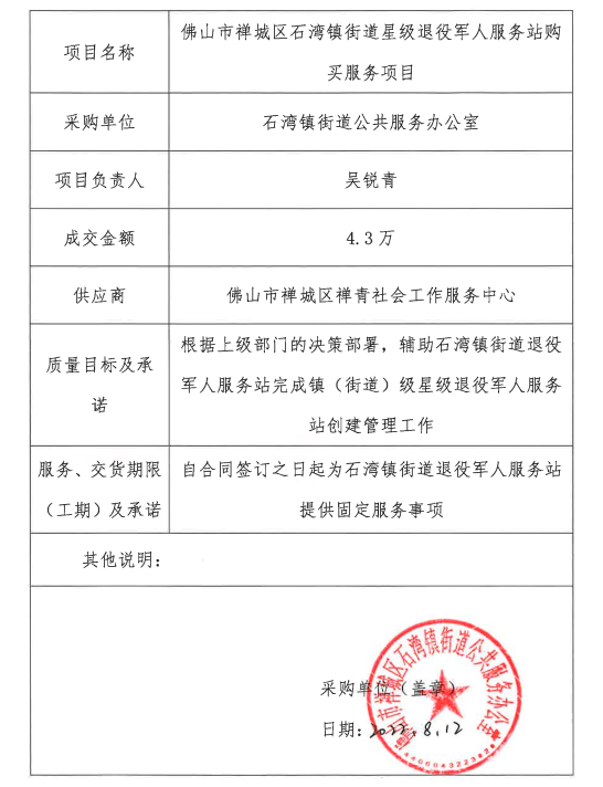 禅城区石湾镇街道星级退役军人服务站购买服务项目采购结果公告