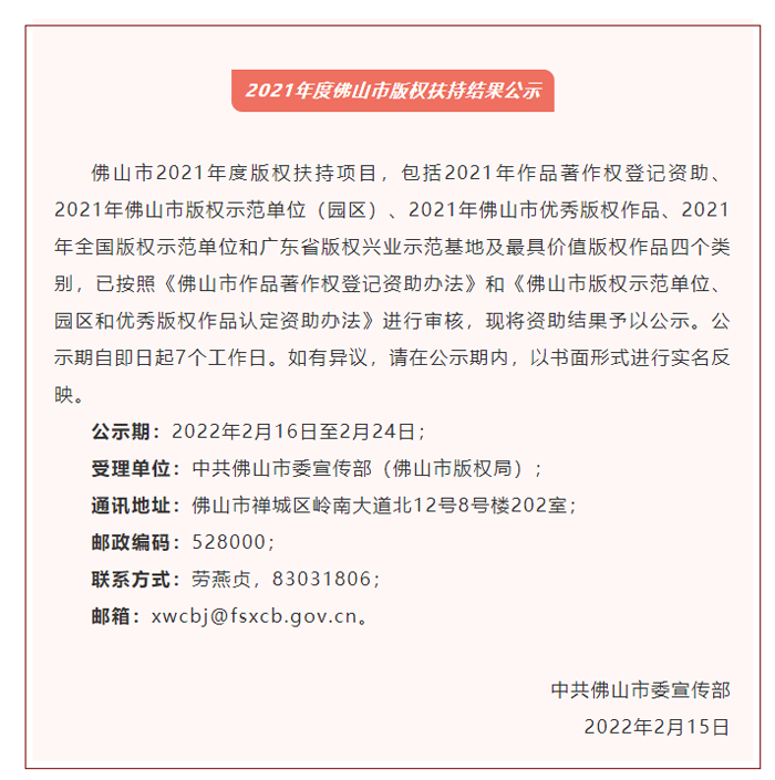 2月15日,佛山市委宣传部(市版权局)公示2021年度佛山市版权扶持结果。佛山市东鹏陶瓷有限公司等8家2021年佛山市版权示范单位、园区拟获得20万元资金资助。资助结果公示期为2022年2月16日至2月24日。以下为公示全文: