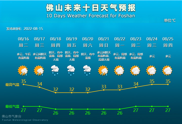 据佛山市气象台预报,今明两天佛山天气炎热,有雷阵雨;受海上东风波影响,本周后期降雨频繁,高温缓解,其中8月18日至20日有中雷雨、局部大雨降水过程。