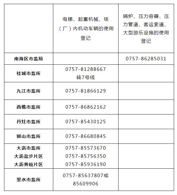 为进一步推动特种设备政务服务相关事项线上办理,提高企业办事效率,南海区已于2022年8月1日起实行特种设备使用登记相关事项全程网上办理,南海区市场监管局将做好有关宣传和业务指导工作,实现“让数据多跑路,让企业少跑腿”的目标。请广大申请人相互知照,如有业务疑问请拨打相关业务对应辖区街道联系方式进行咨询办理:
