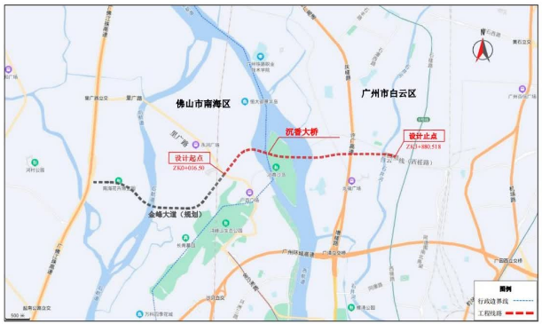 环评报告中透露,沉香大桥项目全长3.86公里,其中佛山境内段为0.95公里,广州境内段为2.91公里。主要控制点为彩滨北路立交、沉香大桥、西华海大桥、增槎路立交。