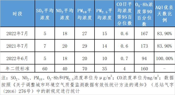 2022年7月,佛山市二氧化硫(SO2)、二氧化氮(NO2)、可吸入颗粒物(PM10)、细颗粒物(PM2.5)平均浓度分别为5、18、27、15微克/立方米,一氧化碳(CO)日平均浓度的第95百分位数为0.6毫克/立方米,臭氧日最大8小时滑动平均(O3-8h)浓度的第90百分位数为167微克/立方米。按照空气质量指数(AQI)评价,全市优良天数占整月有效天数的83.9%。