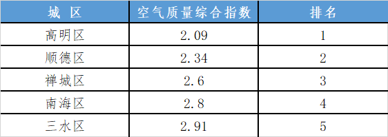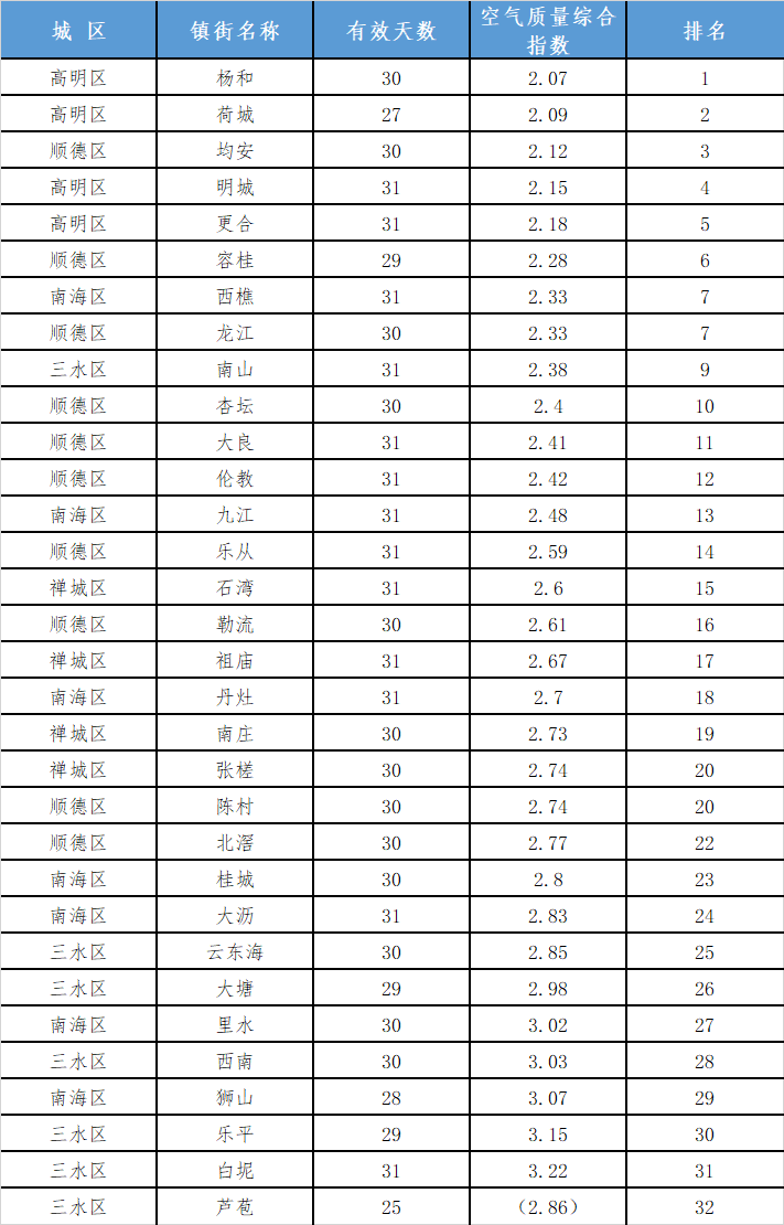 注:采用镇街区域内属性级别最高的一个测点的空气质量综合指数进行排名;有效天数不足镇街的空气质量综合指数采用“()”标识