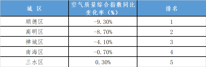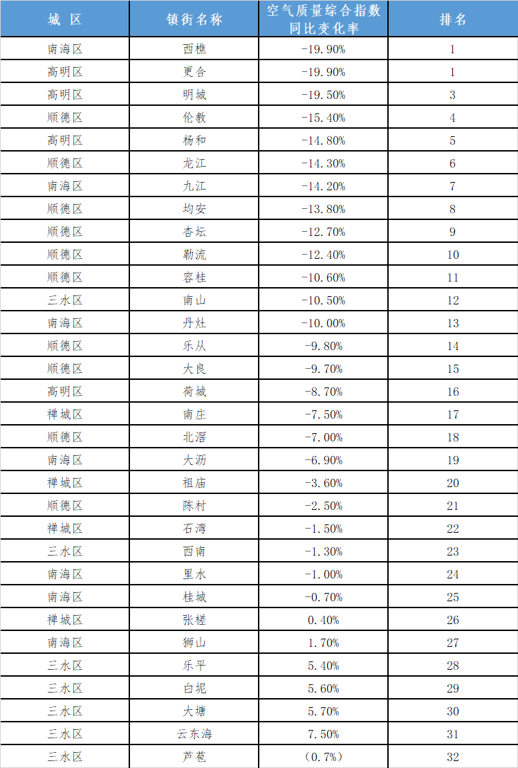 注:采用镇街区域内属性级别最高的一个测点的空气质量综合指数同比变化进行排名;空气质量综合指数同比变化率为负数代表改善,为正数代表恶化,为0代表持平;有效天数不足镇街的空气质量综合指数同比变化采用“()”标识