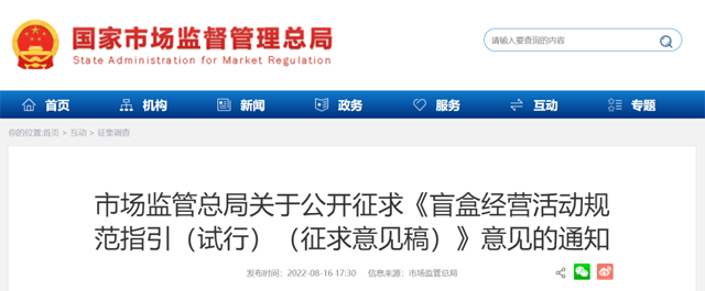 为引导盲盒经营者诚信守法经营,根据有关法律法规,市场监管总局起草了《盲盒经营活动规范指引(试行)(征求意见稿)》,现向社会公开征求意见。欢迎社会各界提出意见建议,意见反馈截止日期为2022年8月30日。公众可通过以下途径和方式提出意见: