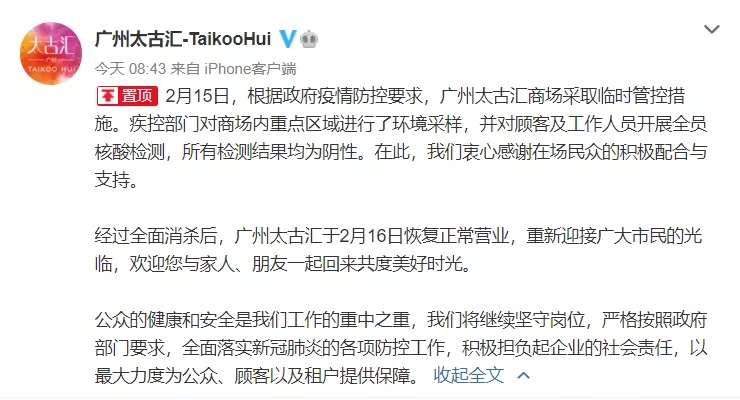 公告称,2月15日,根据政府疫情防控要求,广州太古汇商场采取临时管控措施。疾控部门对商场内重点区域进行了环境采样,并对顾客及工作人员开展全员核酸检测,所有检测结果均为阴性。