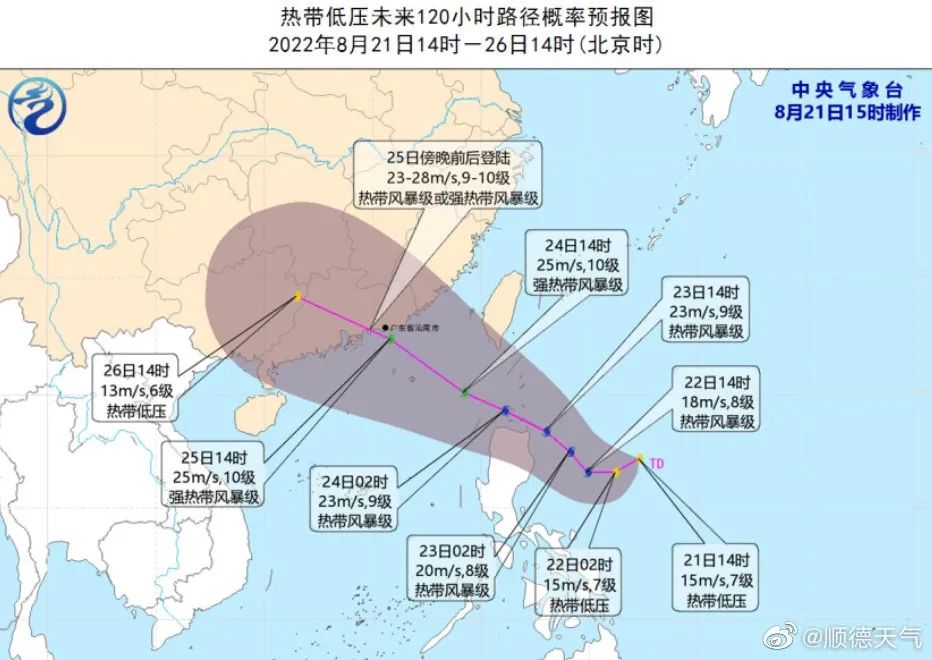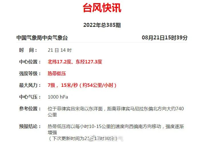 原位于菲律宾以东洋面上的热带扰动已于8月21日14时加强为热带低压,其中心位于距离菲律宾马尼拉东偏北方向约740公里的西北太平洋洋面上,也就是北纬17.2度、东经127.3度,中心附近最大风力7级(15米/秒)。预计,热带低压将以15公里左右的时速向西北方向移动,强度逐渐加强。