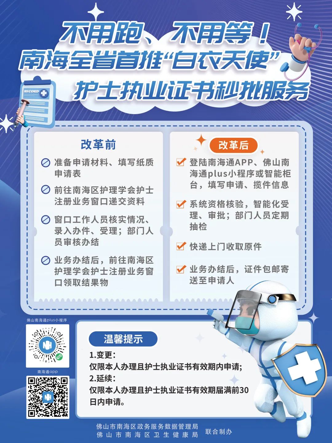 8月19日,南海区卫健局和区政数局在全省率先联合推出护士执业证书变更、延续等事项的“秒办秒批”创新服务,用“政务服务温度”和“数据跑腿速度”切实为医护人员在投入防疫工作的同时解除后顾之忧。今后,南海区的执业护士们可通过“南海通”APP、“佛山南海通plus”小程序或智能柜台即可办理相关业务。在常态化疫情防控期间,为医务工作者提供更多便利是此次首推护士执业证书延续和变更事项的“全程网办”的重要原因之一。
