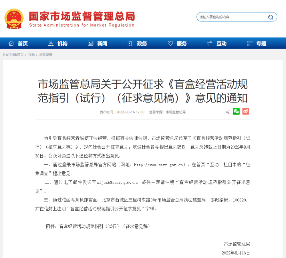 当前,玩具、餐饮、美妆、文具、图书等诸多消费领域都掀起了“盲盒风”,消费市场上随处可见盲盒的身影。为引导盲盒经营者诚信守法经营,根据有关法律法规,市场监管总局16日发布《盲盒经营活动规范指引(试行)(征求意见稿)》,向社会公开征求意见。