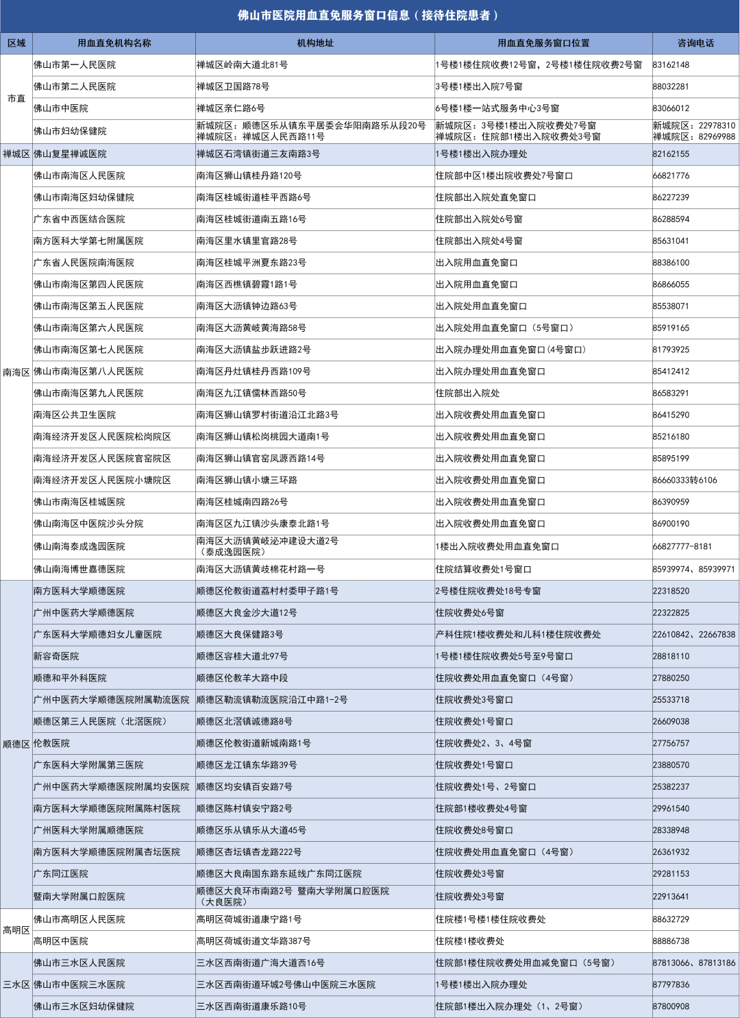 佛山血站:我们已为您整理好全市五区医院的用血直免窗口信息。欢迎查阅下面详细列表,包括了服务窗口所在的医院和具体位置,还有咨询电话。点击下图可以放大查看,保存图片还更方便日后查看哦。