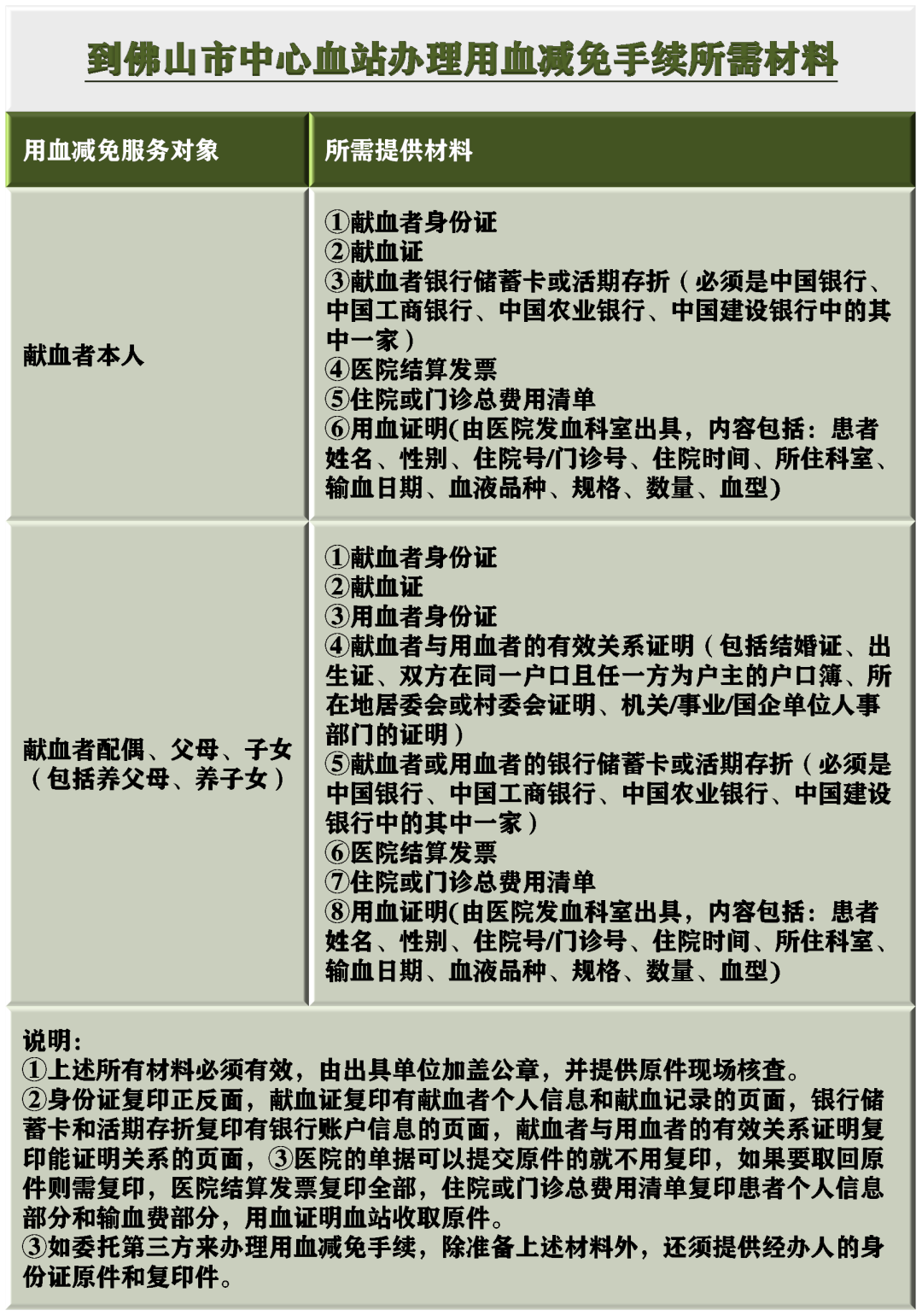 佛山血站:当然不一样了。大家可以在工作时间拨打上面表格所列的医院和血站的电话进行咨询。我们也分别整理了在医院和在佛山市中心血站办理手续所需要提供的材料清单,如下图所示。欢迎收藏、转发。
