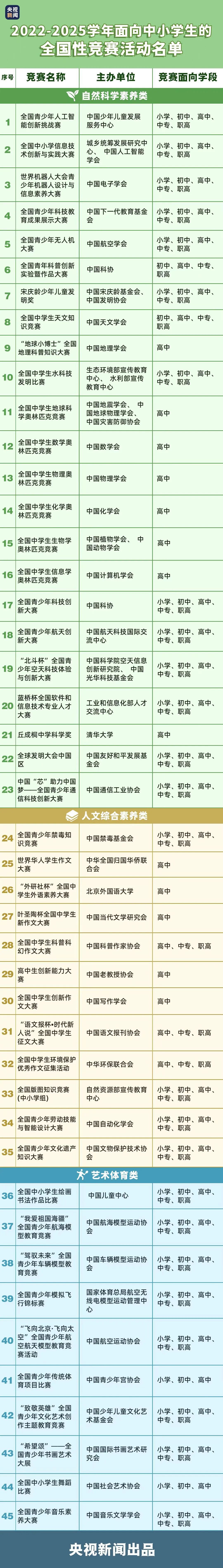 教育部办公厅昨日(8月23日)发布通知,公示2022-2025学年面向中小学生的全国性竞赛活动名单。