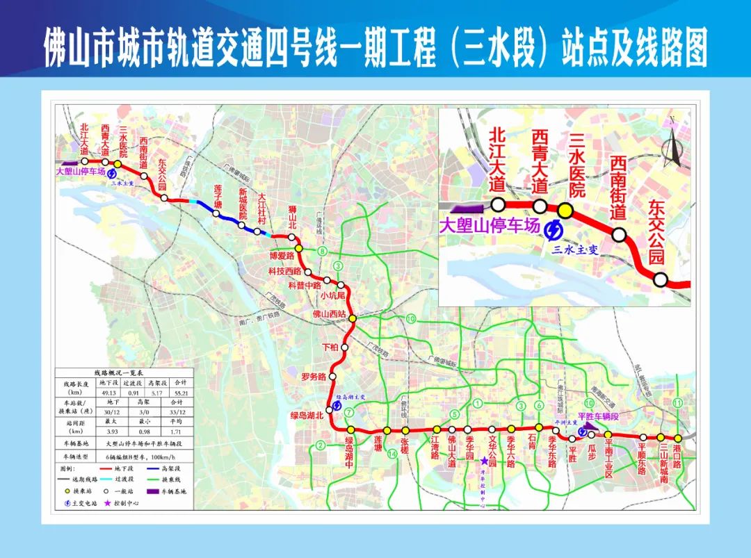 佛山市城市轨道交通4号线一期工程呈西北至东南走向,起自三水区北江大道站,经西青大道、广海大道东、科技路,下穿东平水道,经季华路,再次下穿东平水道后,经三龙湾大道,止于南海区港口路站。线路全长55.21km(地下段49.13km,过渡段0.91km,高架段5.17km),总投资453.74亿元;设33座车站(地下30座,高架3座),其中三水区内一共设置5座地下车站,从西往东依次为:北江大道站、西青大道站、三水医院站、西南街道站、东交公园站,全长约7.1km,投资概算值57.2亿元;设置一座停车场:大塱山停车场;一座主变电站:三水主变电站。
