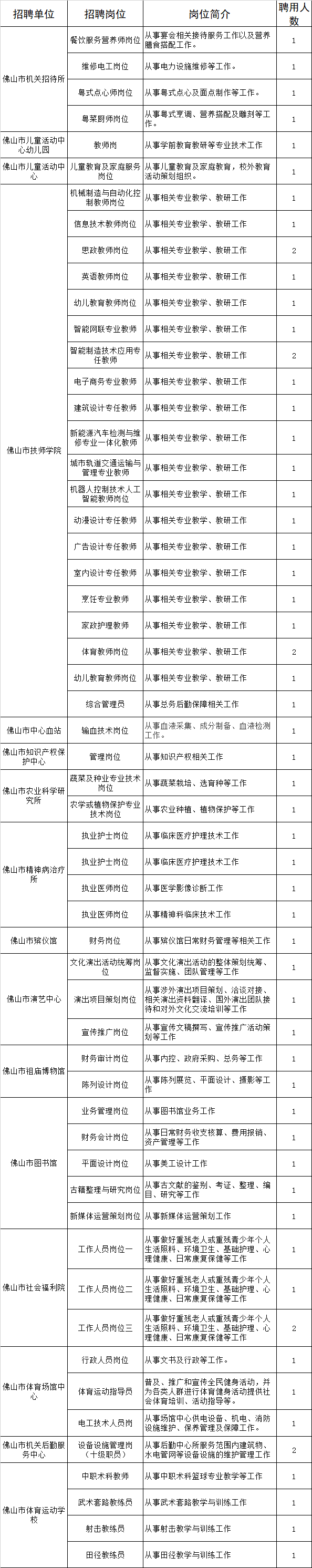 参加本次招聘的市直事业单位共16个,招聘岗位共56个,计划招聘事业单位编制工作人员61名。报考者可通过佛山组织工作网或佛山市人力资源和社会保障局网查阅具体的招聘单位、岗位、人数和报考资格条件。
