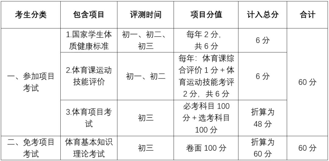 (二)中考体育考试总成绩由《国标》测试成绩6分、《体评》测评成绩6分和体育项目考试成绩48分组成。