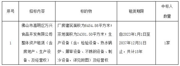 二、项目名称:佛山市高明区万兴食品开发有限公司整体资产租赁(含房地产、生产设备、及经营权)
