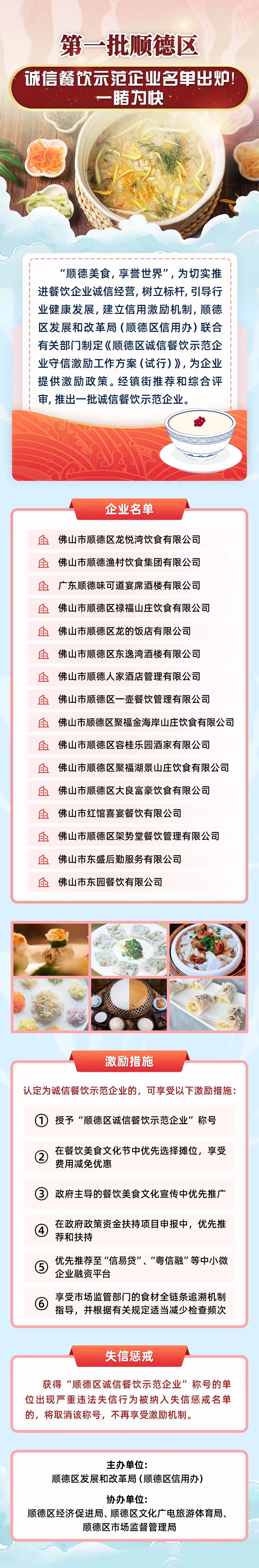 据了解,为促进顺德区餐饮企业诚信经营,充分激发和调动顺德区餐饮企业诚信经营的积极性和主动性,促进形成担当作为、竞相发展的良好局面,营造守信受益、信用有价的浓厚氛围,今年2月,顺德区发展和改革局(顺德区信用办)联合顺德区经济促进局、顺德区市场监督管理局和顺德区文化广电旅游体育局整合多方资源制定了《顺德区诚信餐饮示范企业守信激励工作方案(试行)》,决定开展诚信餐饮示范企业认定,并联合推出优先推荐政府政策资金扶持项目申报、根据规定适当减少检查频次、作为优质企业优先推荐至信用融资平台等多项激励政策。