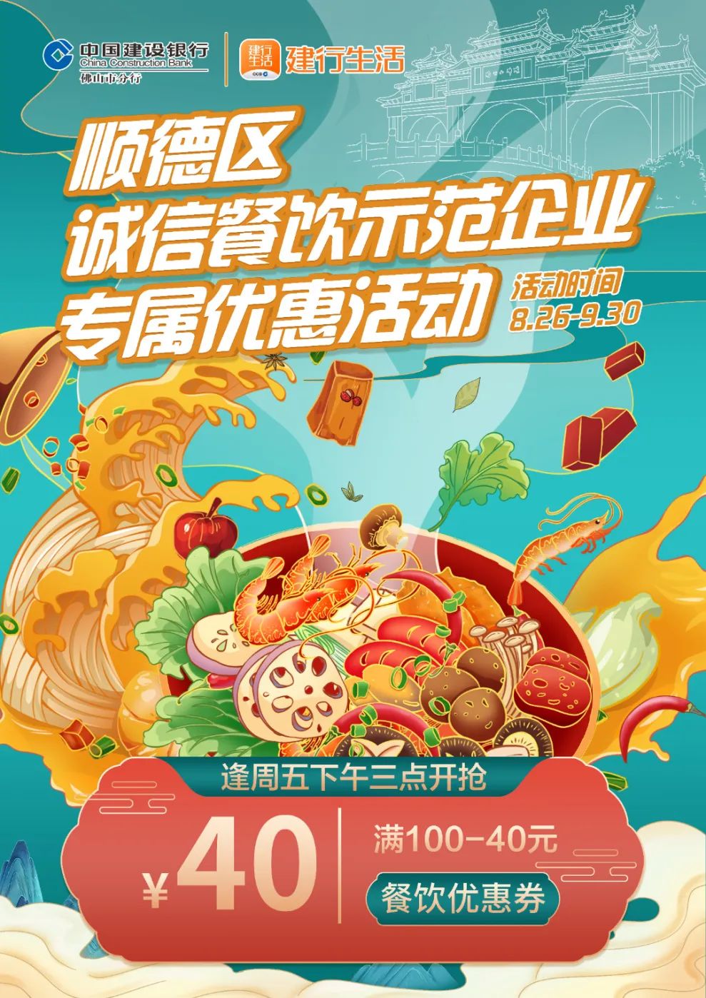 8月26日起,“建行生活”APP连续6周派发100-40元消费券,市民可领券在诚信餐饮示范企业消费。