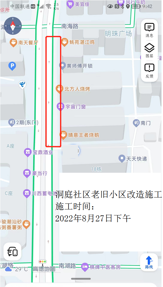 2022年洞庭社区老旧小区改造工程施工在8月27日下午施工,期间需要对明珠广场南海路附近的以下路段实施交通管制。
