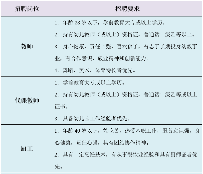 3. 有厨师工作经验或中小学、幼儿园饭堂工作经验者优先考虑。