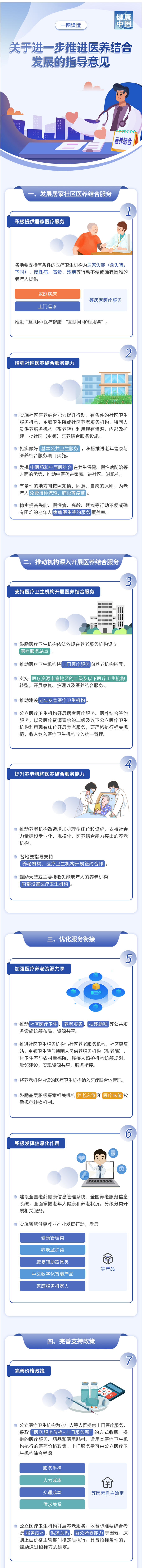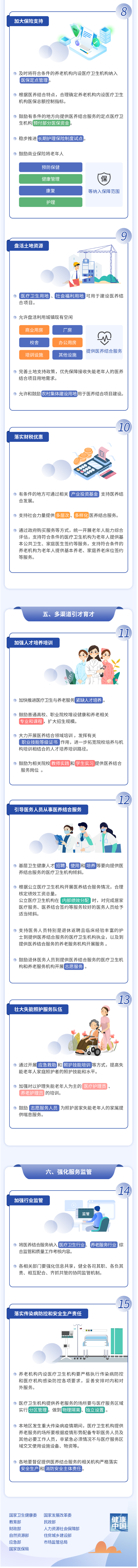 近日,国家卫生健康委、国家发展改革委、教育部、民政部、国家医保局等11个部门印发《关于进一步推进医养结合发展的指导意见》(以下简称《指导意见》)。《指导意见》从发展居家社区医养结合服务、推动机构深入开展医养结合服务等6方面提出15条具体措施,不断满足老年人健康和养老服务需求。