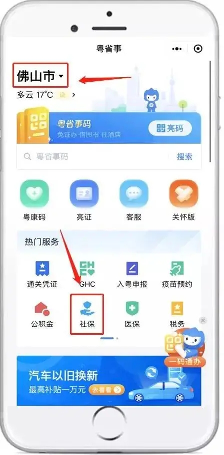 1、微信搜索“粤省事”小程序,进入小程序首页左上角切换城市为佛山市,选择“社保”服务板块(如未关联社保卡可按照页面提示关联社保卡)。