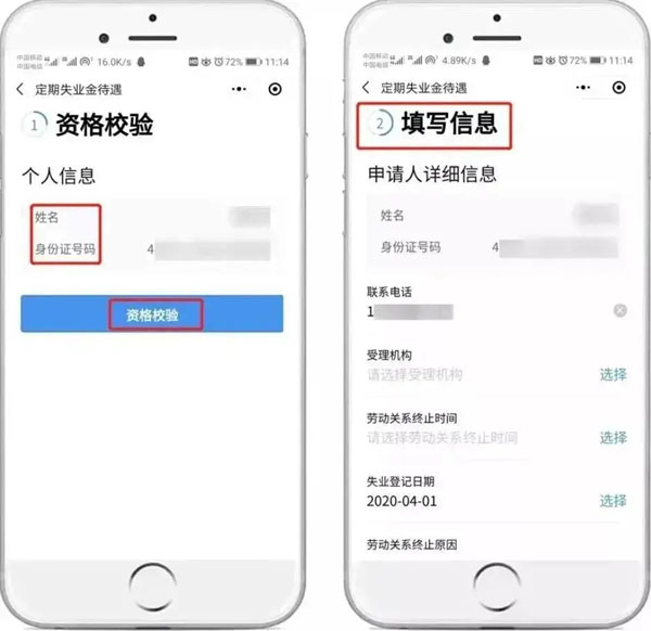5、校验通过,进入填写信息页面,系统通过数据比对自动获取联系电话、劳动关系终止原因、银行账户等信息。