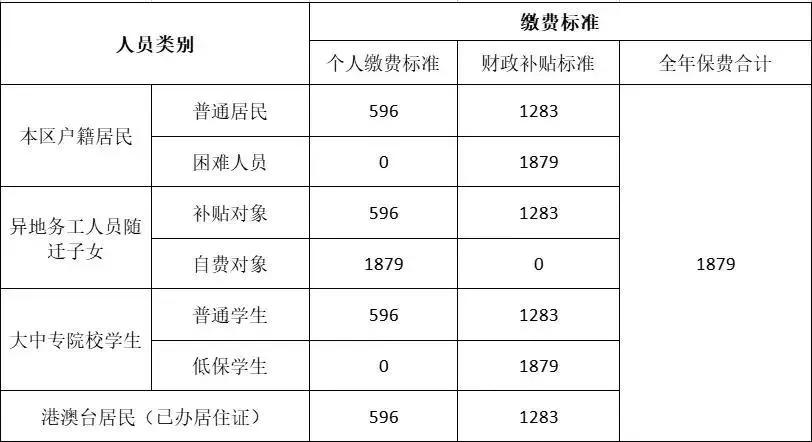 注:保险费按全年标准一次性缴纳。参保人缴纳由个人负担的保险费,财政补贴部分由区、镇(街道)财政负担。新生儿中途参保,待遇追溯到其出生之日,若业务申报时间与出生日跨年,须缴纳2年保险费;新迁入户我市中途参保,待遇自缴费达帐次月生效,须缴纳申报当年保险费。