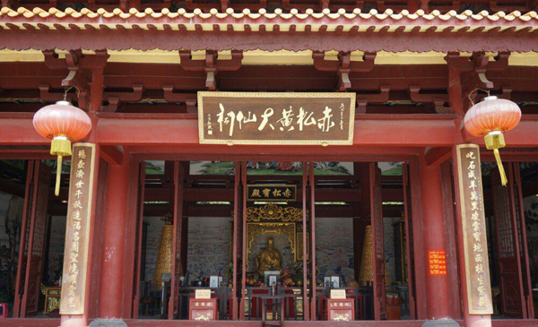 黃大仙原名黃初平,生于西元328年,擅长炼丹和医术,赠医施药、普济劝善,为世人敬仰,因此民间素有祀奉黃大仙的习俗。 黄大仙金像左边是王重阳金像,右边是吕洞宾金像,三者都是道教代表人物。在祠堂左边有一个大葫芦,是黄大仙的药葫芦。相传黄大仙在世时,当地曾发生一场瘟疫,当时黄大仙就是用自己的药葫芦治愈了众生,从此药葫芦也成了黄大仙的一个标志。前来参观的游客摸一摸药葫芦,寓意除病驱邪,让黄大仙保平安健康。 赤松宝殿右边是元辰殿,元辰殿内设60尊金箔打造的小金像,每个小金像下摆设有一个带孔的柜子。游客参拜后可把愿望写在纸上并投入箱中,祈求愿望实现。赤松宝殿后面是财神殿,财神殿里供奉着一位文财神,文财神的法宝是他手里的聚宝盆。相传,只要把手伸进聚宝盆就能得到你想要的东西。所以,在文财神像的右边设有一个重达100公斤的由纯银打造的聚宝盆,该聚宝盆造价超过百万。