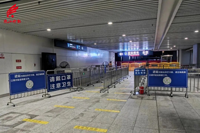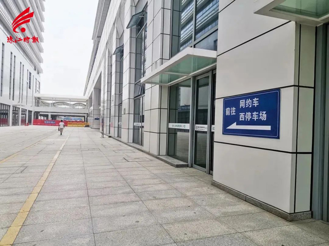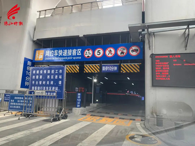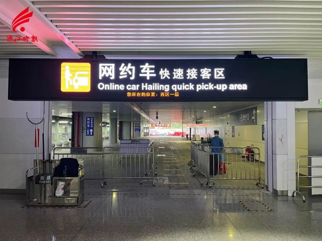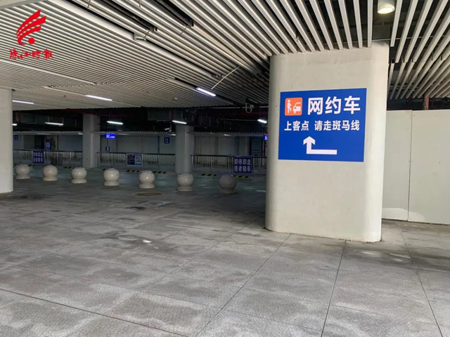 通过公交下客区进站防疫检查岗后,绕行南通廊前往西区,再根据指引进去网约车上车点。