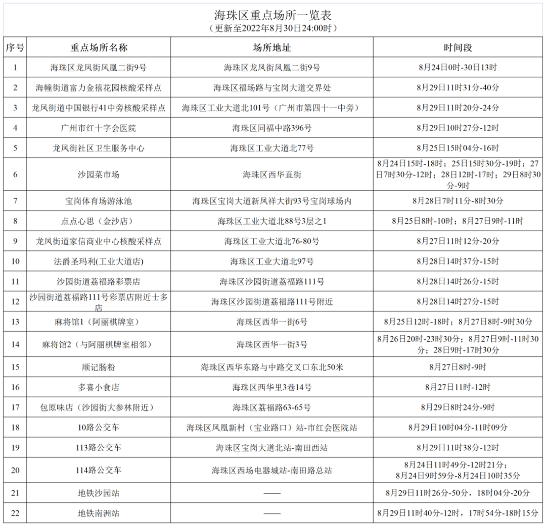 地址:生南一街33号、生北市场街8号、海南三社社祉、南丫公园对面、香凝街25号、赤岗西约七巷18号、棉琴路棉村市场旁、海善苑及香凝小区、十社高架桥底、十一社篮球场、水口坊146号、菊树地铁站D出口、天嘉大街78号、流动采样点