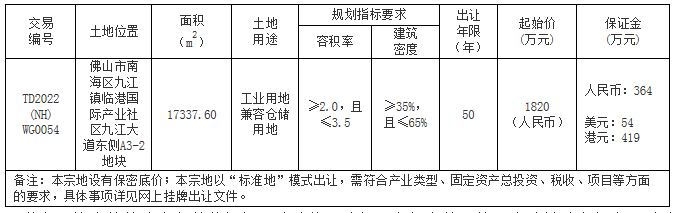 八、自本次公告起至网上挂牌截止期间,如有关于本宗地竞买文件的修改、澄清、说明等将通过网上交易系统以及佛山市南海区人民政府网发布,请有意参与竞买者密切留意。其它未尽事宜,详见本宗地的网上挂牌出让文件。