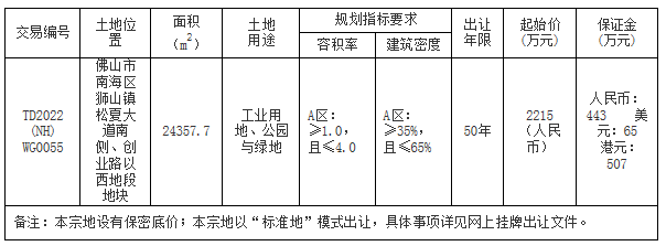 八、自本次公告起至网上挂牌截止期间,如有关于本宗地竞买文件的修改、澄清、说明等将通过网上交易系统以及佛山市南海区人民政府网发布,请有意参与竞买者密切留意。其它未尽事宜,详见本宗地的网上挂牌出让文件。