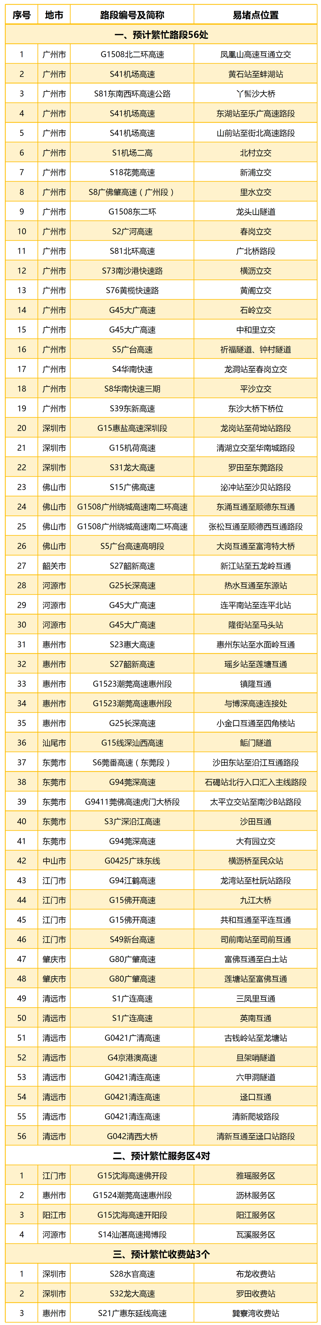 预计车流较大的服务区是佛开高速雅瑶服务区、潮莞高速沥林服务区、开阳高速阳江服务区和揭博高速瓦溪服务区等4对。