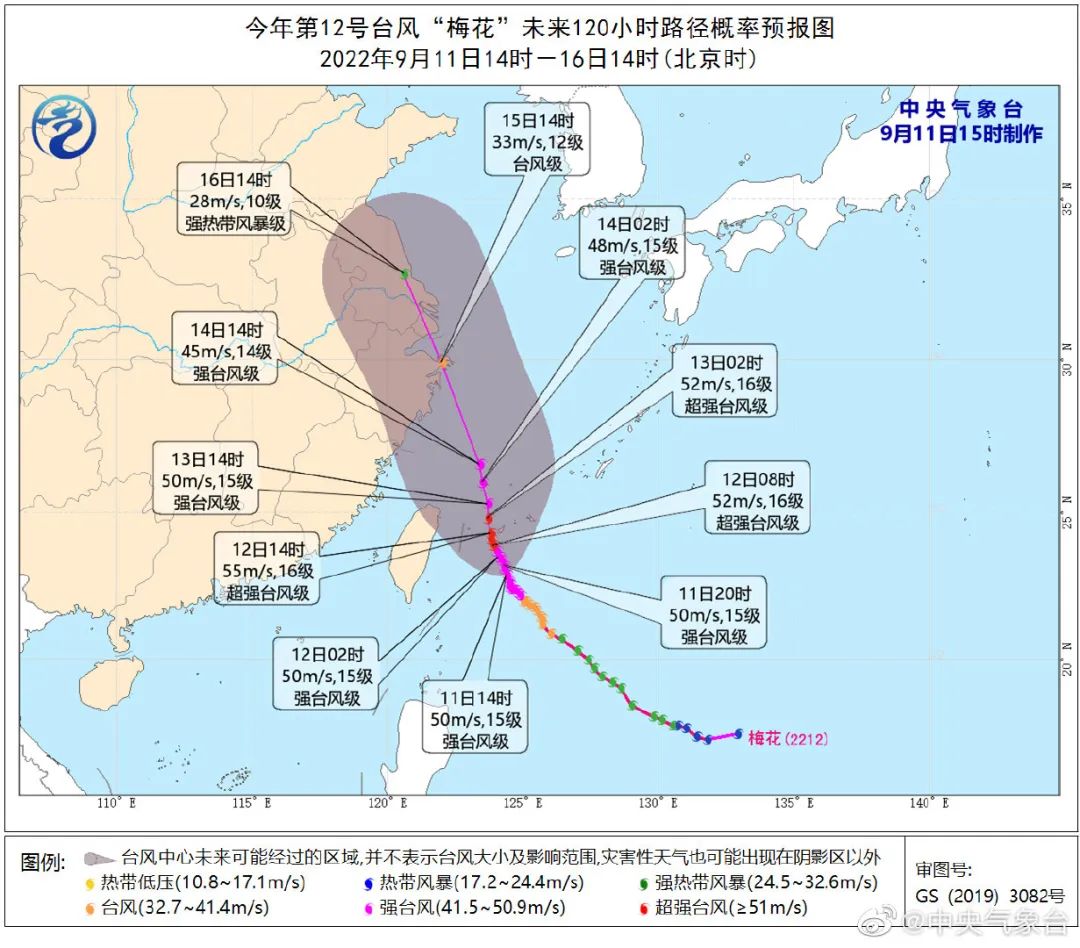 据中央气象台今天下午消息:今天15时,“梅花”中心附近最大风力已达15级(50米/秒),强度维持在强台风级,预计“梅花”的强度还有继续增强的空间,最强可达48~55米/秒(15~16级,强台风级或超强台风级),12日晚上强度开始缓慢减弱,并继续向西北方向移动,穿过琉球群岛后进入东海南部海面,逐渐向浙江东部沿海靠近,并可能于15日登陆或擦过上述沿海地区。